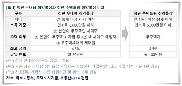 그럼 기존 청년 우대형 청약통장과 새로 출시되는 청년 주택드림 청약통장의 가입기준을 비교해보겠습니다.